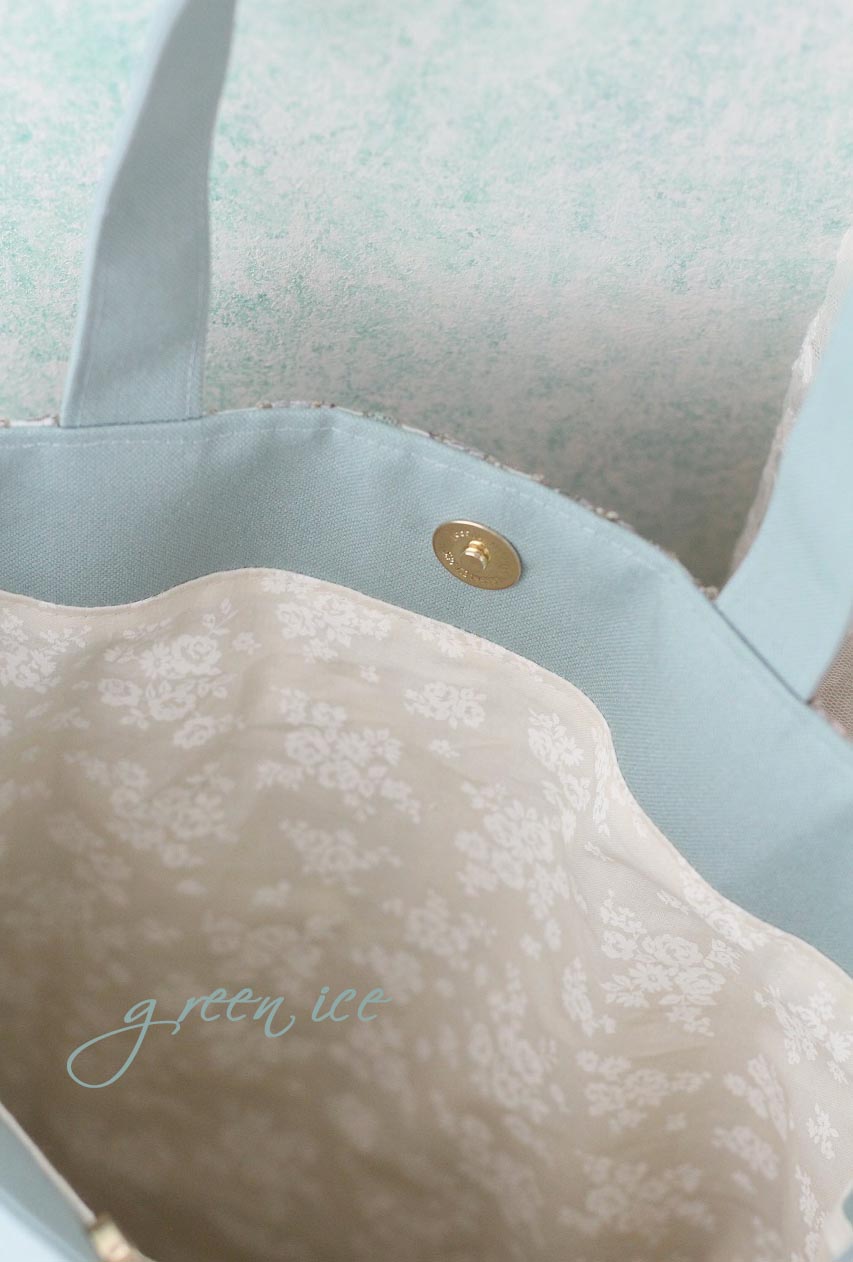 表面切り返し下側、裏面、見返し部分や持ち手は、ミントグリーンカラーのしっかりした生地を使用しています。
